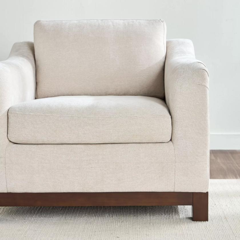 Relax in effortless style with this elegantly designed Samee Fabric Armchair, featuring plush cushioning that delivers exceptional comfort. Built on a durable wooden frame with a sturdy plinth base, it offers lasting stability and strength. Gently curved armrests soften the clean, minimalist silhouette, adding a refined touch of sophistication. Perfectly balanced between comfort and design, this armchair enhances any living space with timeless appeal and everyday ease.