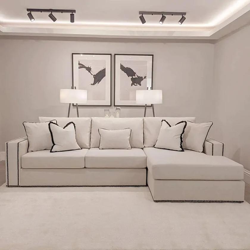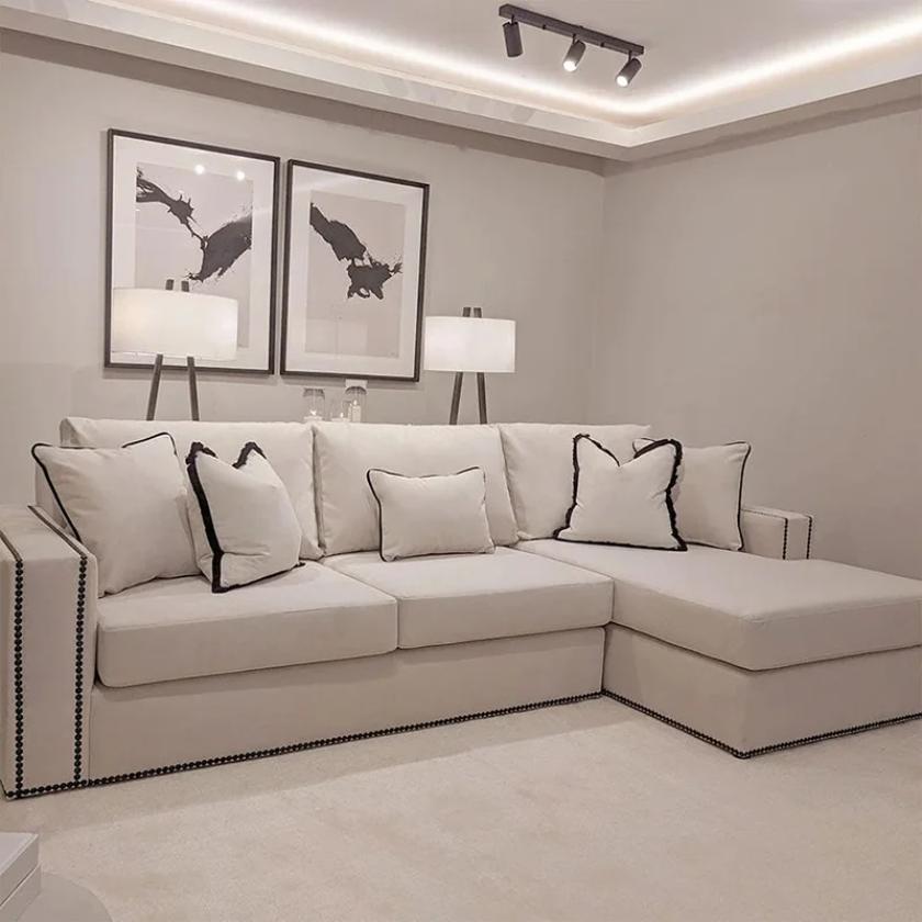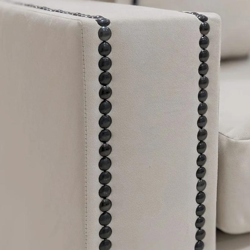 Unwind in style with the Taslim Black Studs Sectional Sofa, designed for ultimate lounging luxury. Featuring super comfy seating and back cushions filled with premium polyester fiber, it offers exceptional support and relaxation. Upholstered in skin-friendly, sumptuously soft cream velvet, this sectional delivers both comfort and elegance. The sleek contemporary silhouette is elevated with luxe black stud detailing, creating a bold, ultra-modern statement. Perfect for any living space, it blends sophistication, comfort, and standout design to effortlessly enhance your home decor.